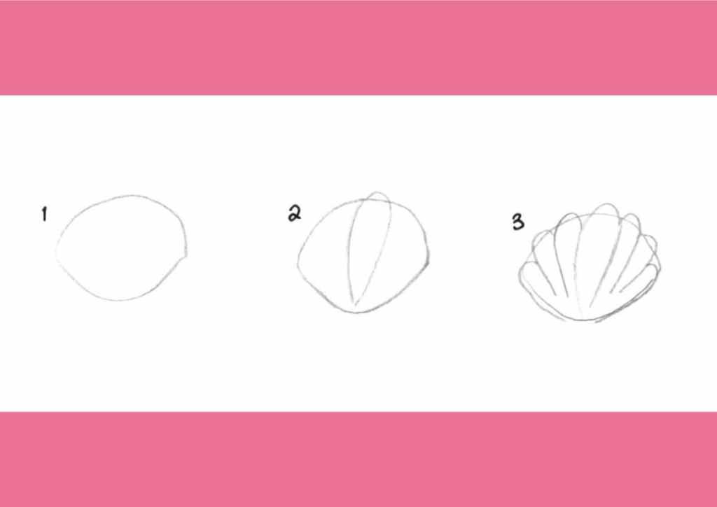 You’ll need: a pencil, an eraser, a smudge-free black pen, and one or two colors in soft shell tones like pink, sandy beige, or light brown β€” plus a slightly darker shade for shading.